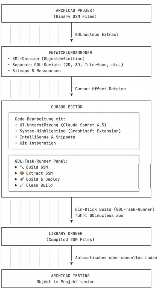 Die Entwicklung von GDL-Objekten für Archicad kann komplex und zeitaufwendig sein. Doch durch die Kombination modernster Tools und künstlicher Intelligenz entsteht eine Entwicklungsumgebung, die Produktivität, Code-Qualität und Entwicklererfahrung auf ein neues Level hebt. In diesem Artikel zeige ich Euch, wie Ihr mit Cursor, Graphisofts GDL Development Environment, GDLnucleus und dem GDL-Task-Runner von b-prisma eine perfekt abgestimmte Toolchain für die professionelle GDL-Entwicklung aufbauen könnt.