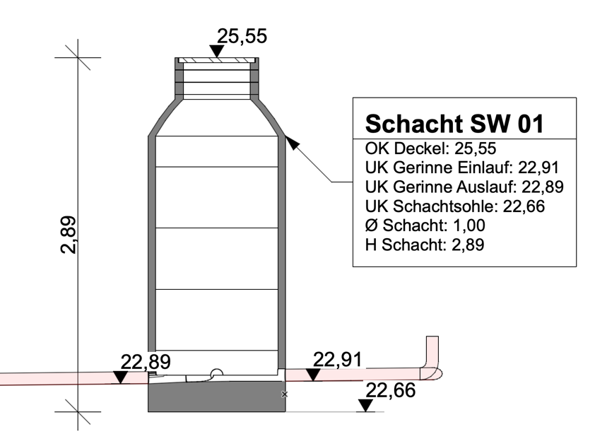 Mit diesem Bibliothekselement lassen sich Kanalschächte, Sickerschächte und Zisternen in Archicad sowohl in 3D als auch in 2D modellieren und anschließend mit einem passenden Etikett beschriften.