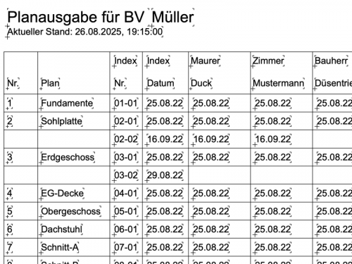 Der Planer muss dann Planlisten und Planversandlisten pflegen. Auch hier liegt die Verantwortung bei der ausführenden Firma, daß der jeweils aktuelle Plan auf der Baustelle vorliegt. Die Erfahrung lehrt, dass dies häufig nicht klappt, der Handwerker hat von seinem Chef nicht die aktuelle Pläne bekommen.